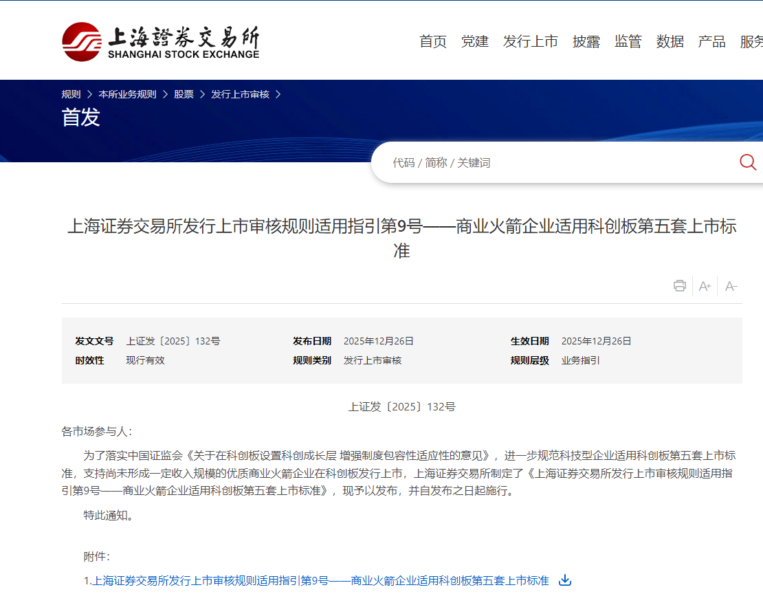 上交所:商业火箭企业适用科创板第五套上市标准